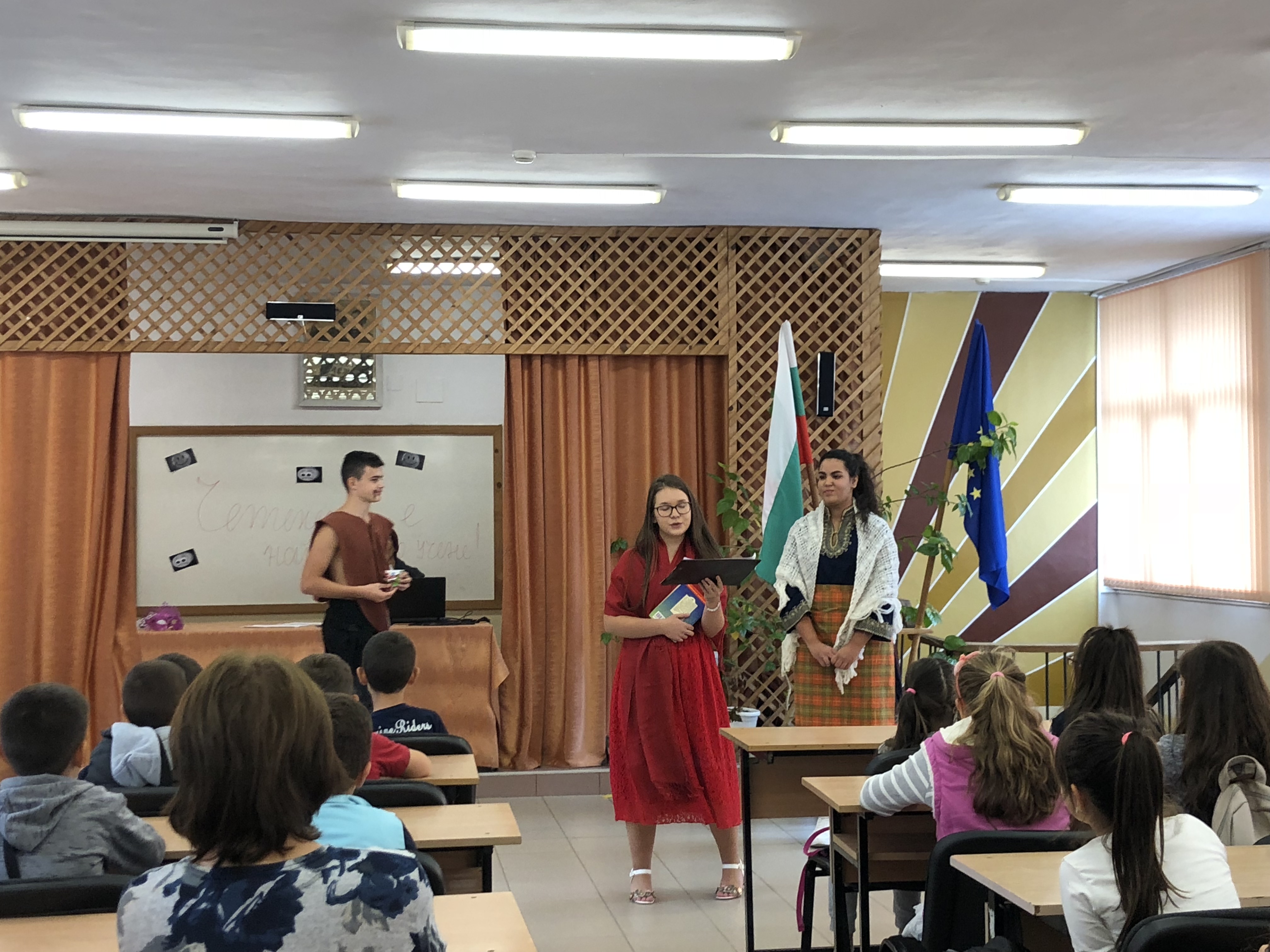 Порасналите вече деца от Ха клас се превъплътиха в ролите на приказни герои. С подходящи костюми и много желание те предсавиха своите любими герои – Пипи Дългото чорапче, Том Сойер, Алиса от „Страната на чудесата“, Пепеляшка и всички герои от едноименната приказка, не бяха забравени и вълкът и лисицата от приказката „Болен здрав носи“.