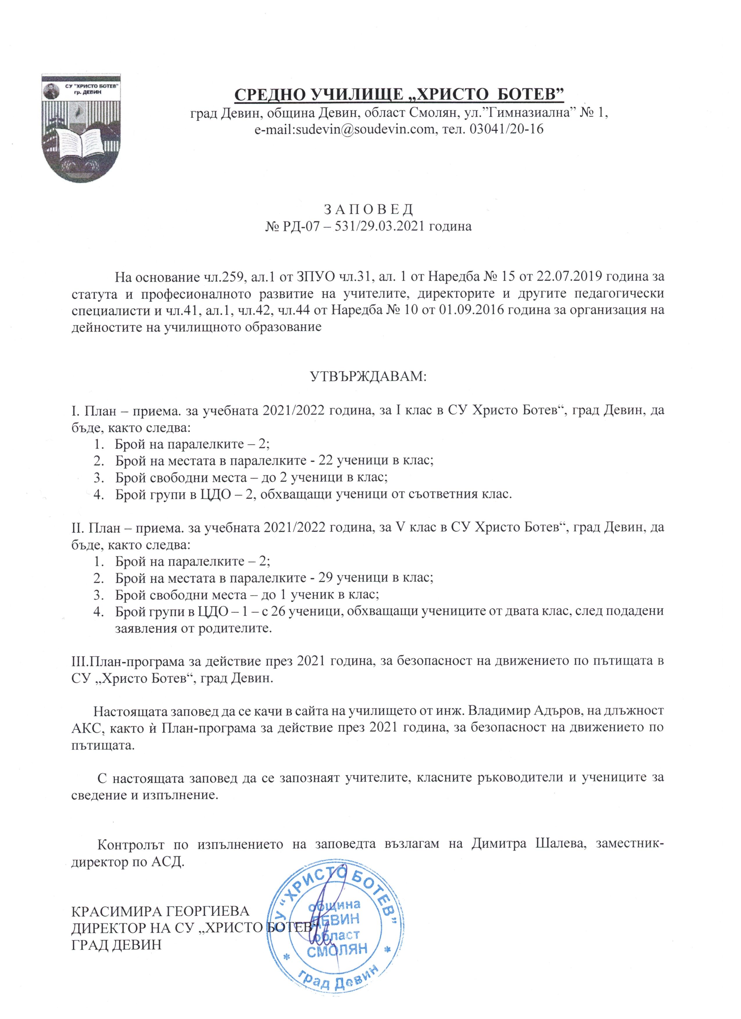 Правила за дейността и управлението на училището за учебната 2021-2022