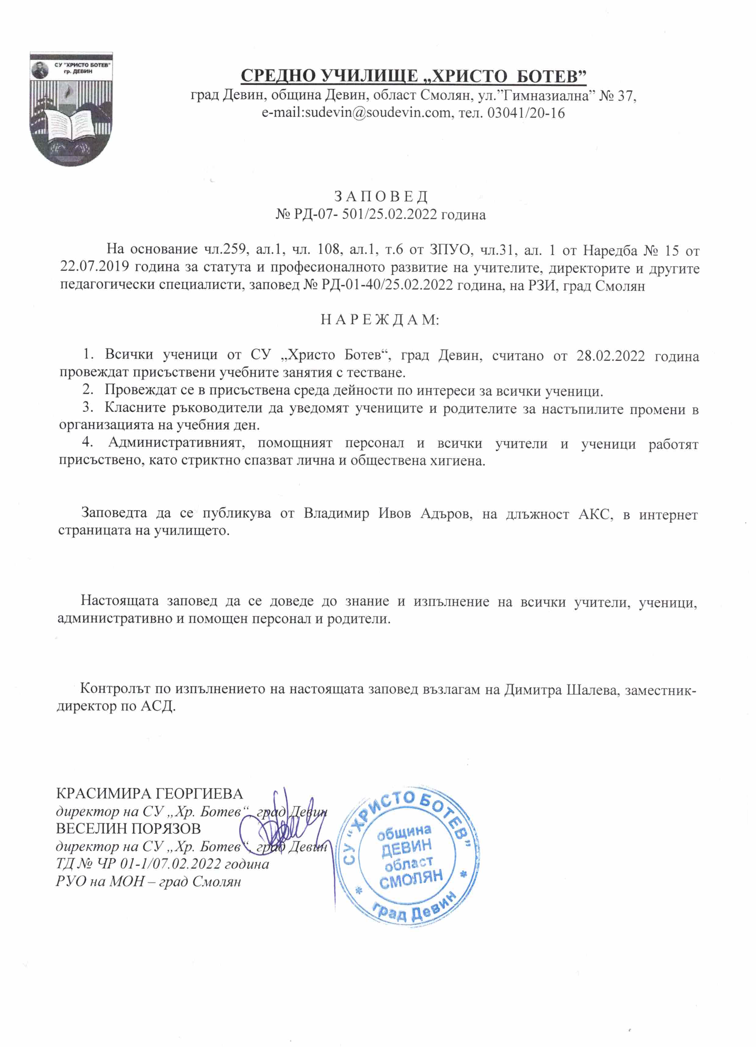 Правила за вътрешно подаване на сигнали в СУ „Христо Ботев“ – Девин